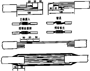 ⑦電纜接頭,將引出電纜與配帶電纜一端用電工刀切去120毫米橡套,然后將三股芯線長短階梯形錯開,剝出20毫米銅芯,用刀刮或用砂布擦去銅線外部氧化層,將對接的兩線頭對插進去,用細銅絲包扎層綁緊后,用錫焊透焊牢,表面砂去毛刺,然后三個接頭分別用滌綸絕緣膠帶半疊式包扎3層,包扎層兩端用尼龍線纏繞扎緊,再用半疊方法包扎股帶3層,外面用高壓絕緣膠帶包扎3層,后將3股合攏,用高壓膠帶反復包扎5層,每層包扎一定要拉緊,層間接縫要嚴密牢固,以免水滲入破壞絕緣。
