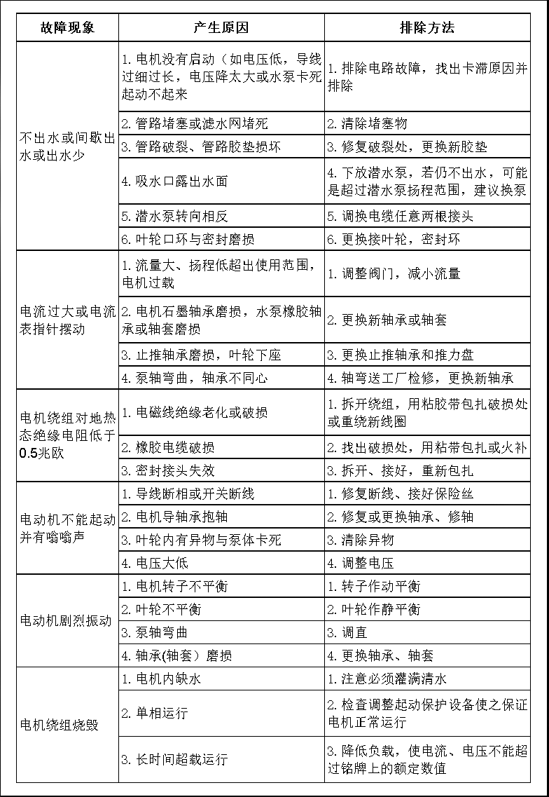 4. 水泵投入正常運行后,為了延長其使用壽命,要定期檢查電源電壓,工作電流和絕緣電阻是否正常,如發現下列情況,應立即停機排除故障。